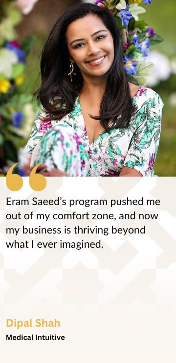 Eram Saeed is the world’s #1 coach for Muslim women entrepreneurs, having overcome significant personal challenges to become a successful businesswoman and advocate for Muslim women seeking to break free from personal pain and struggle. After experiencing two divorces, abusive marriages, and financial hardship as a single mother of two girls, Eram rose from adversity to build a thriving business helping other women heal and embrace the futures ahead of them.